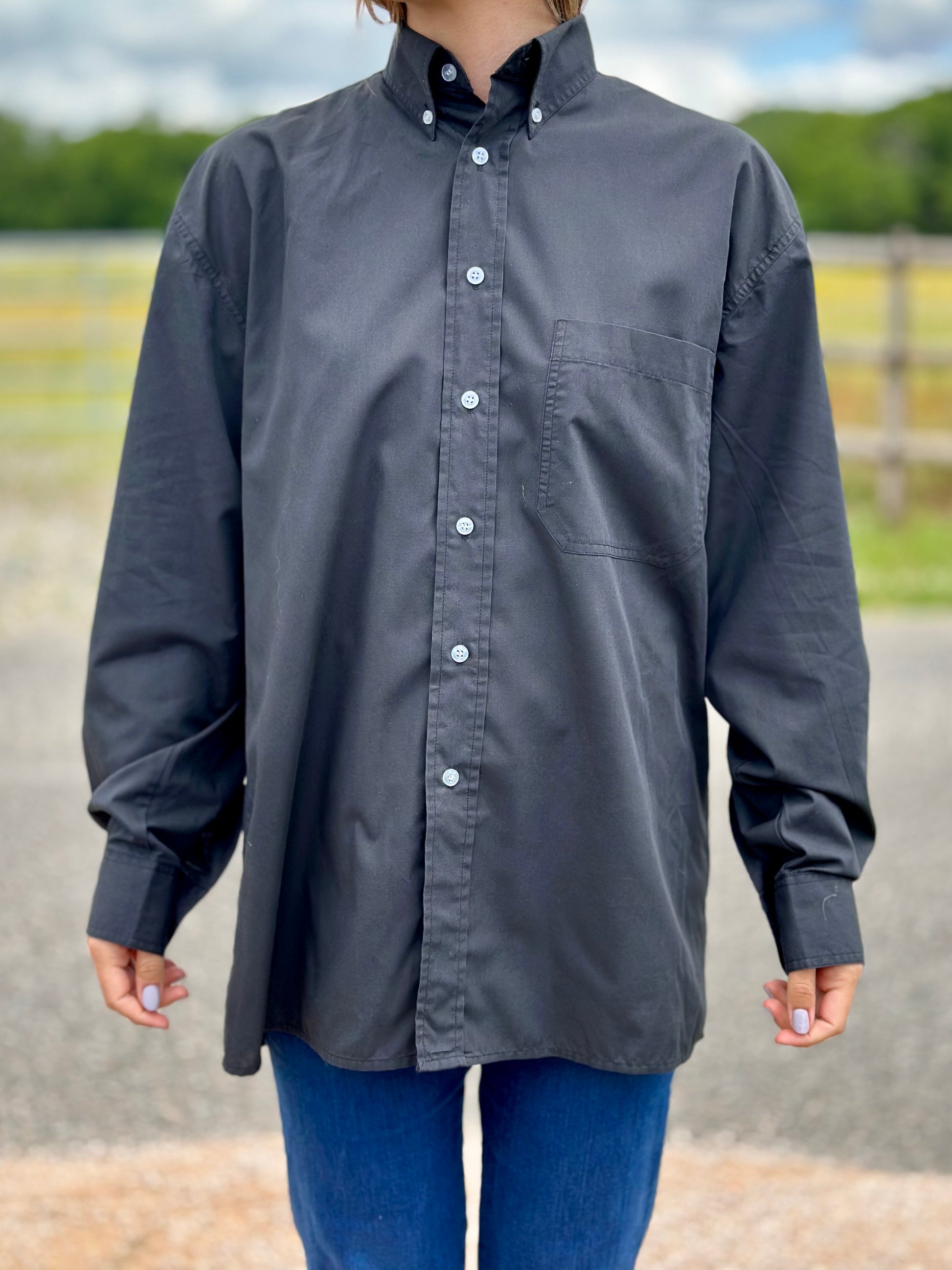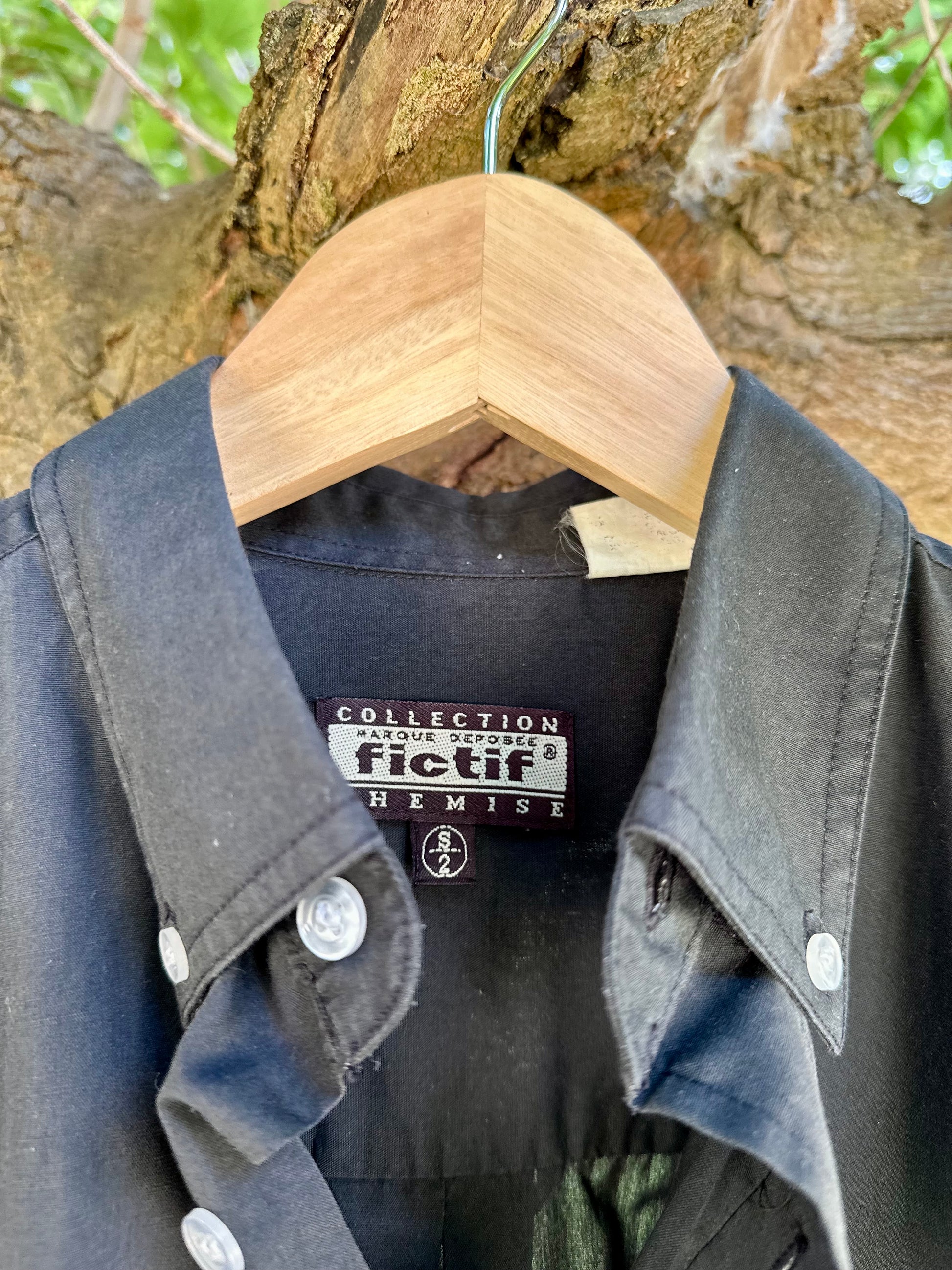 Noire comme la nuit, lisse comme un mensonge bien ficelé. Cette chemise Fictif Vintage ne crie pas, elle susurre. Manche longue pour mieux frôler, coupe ajustée pour mieux troubler. Seconde peau pour celles qui savent que le pouvoir commence par le tissu.