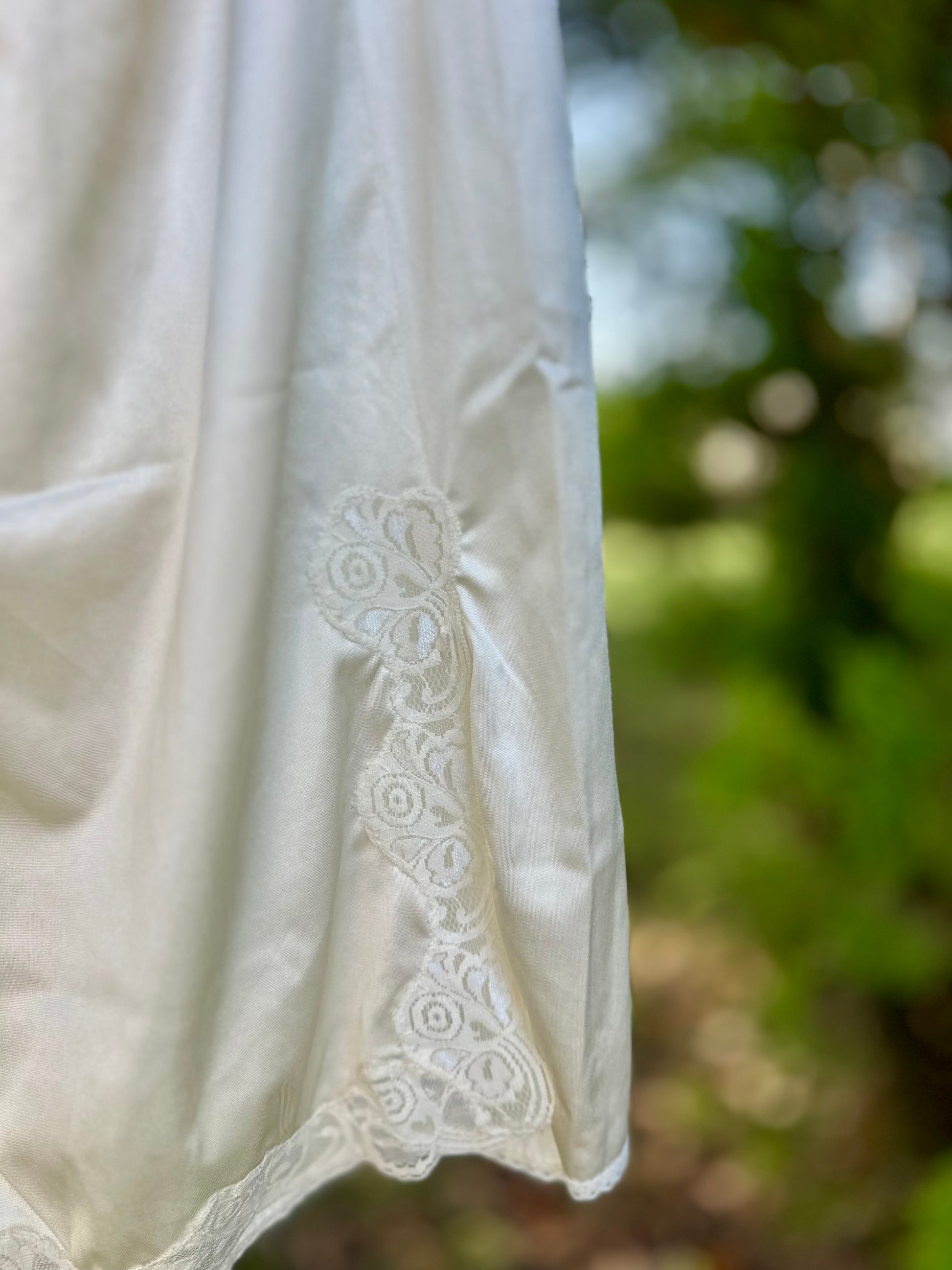 Un souffle d'innocence et de mystère flotte autour de cette jupe en satin crème, légère comme une fin d'après-midi d'été. Son tombé doux épouse la lumière, et ses bordures en dentelle racontent une élégance discrète presque oubliée.