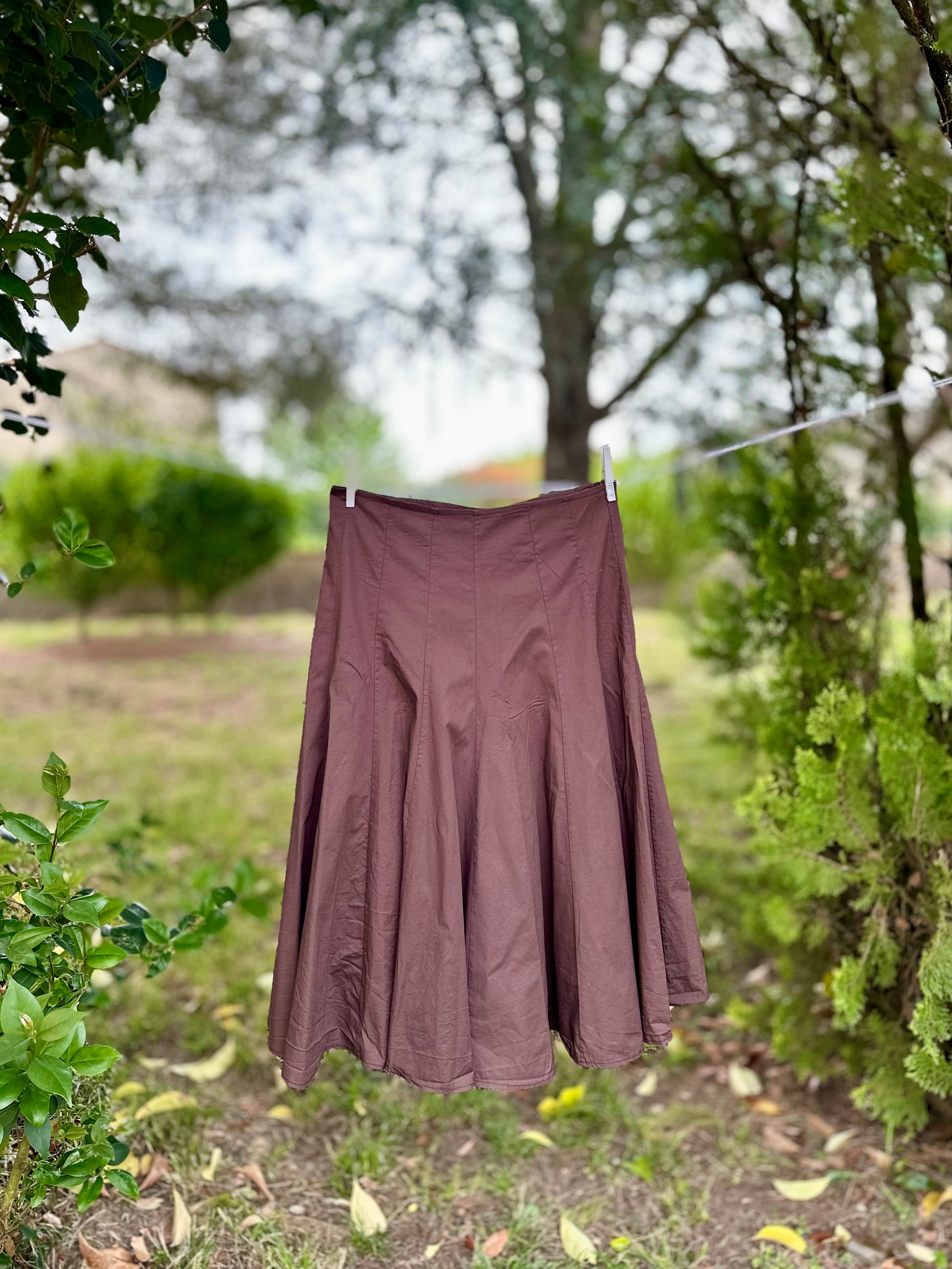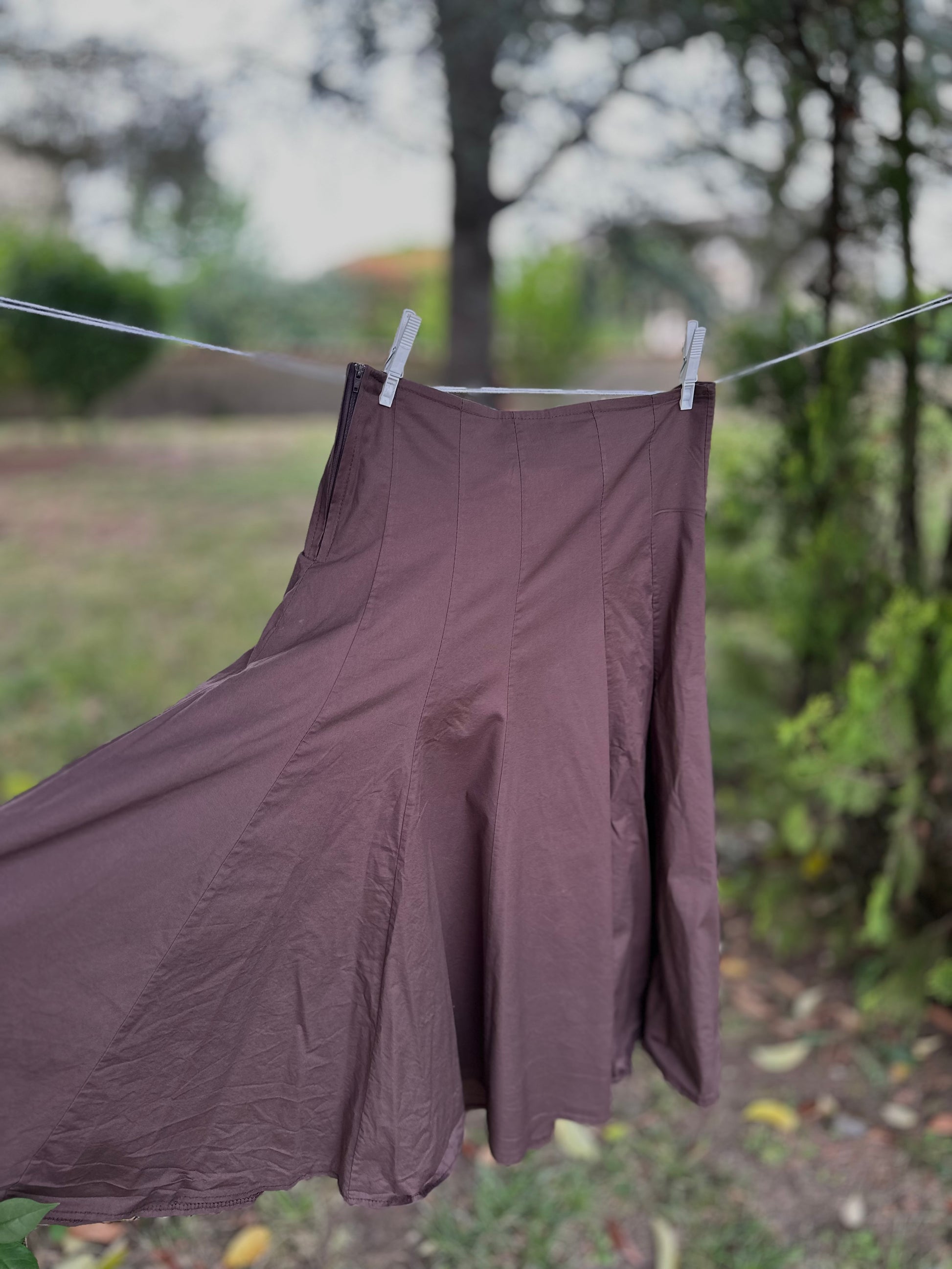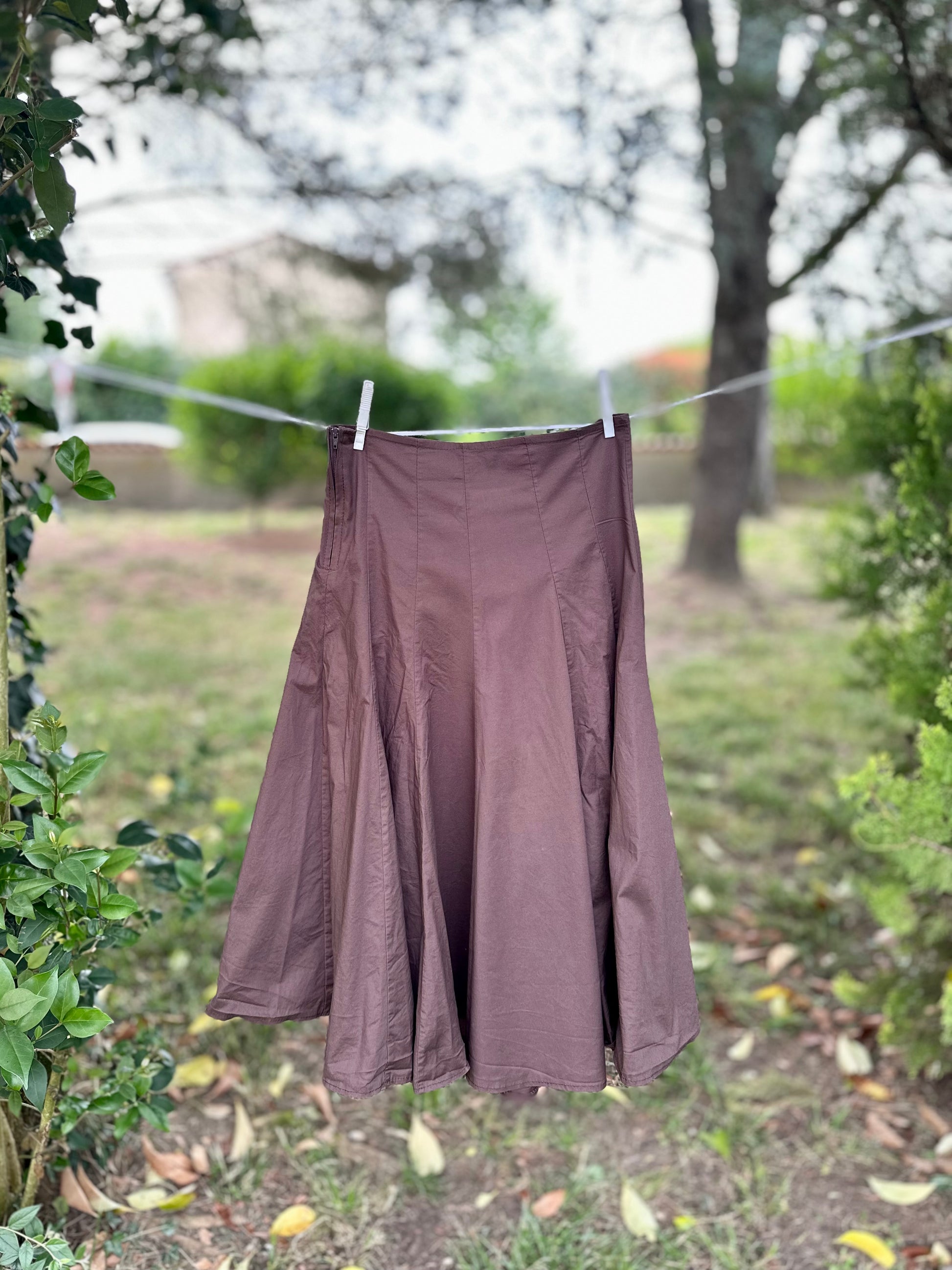 Une jupe qui évoque la douceur des fins d'après-midi d'automne, quand le soleil caresse encore les pavés et que l'air sent la cannelle. Sa teinte brun chaud rappelle la terre battue, les cafés en terrasse, les feuilles qui dansent. Coupe mi-longue, taille haute, tombé fluide : elle suit le mouvement avec élégance, sans jamais voler la vedette à celle qui la porte.