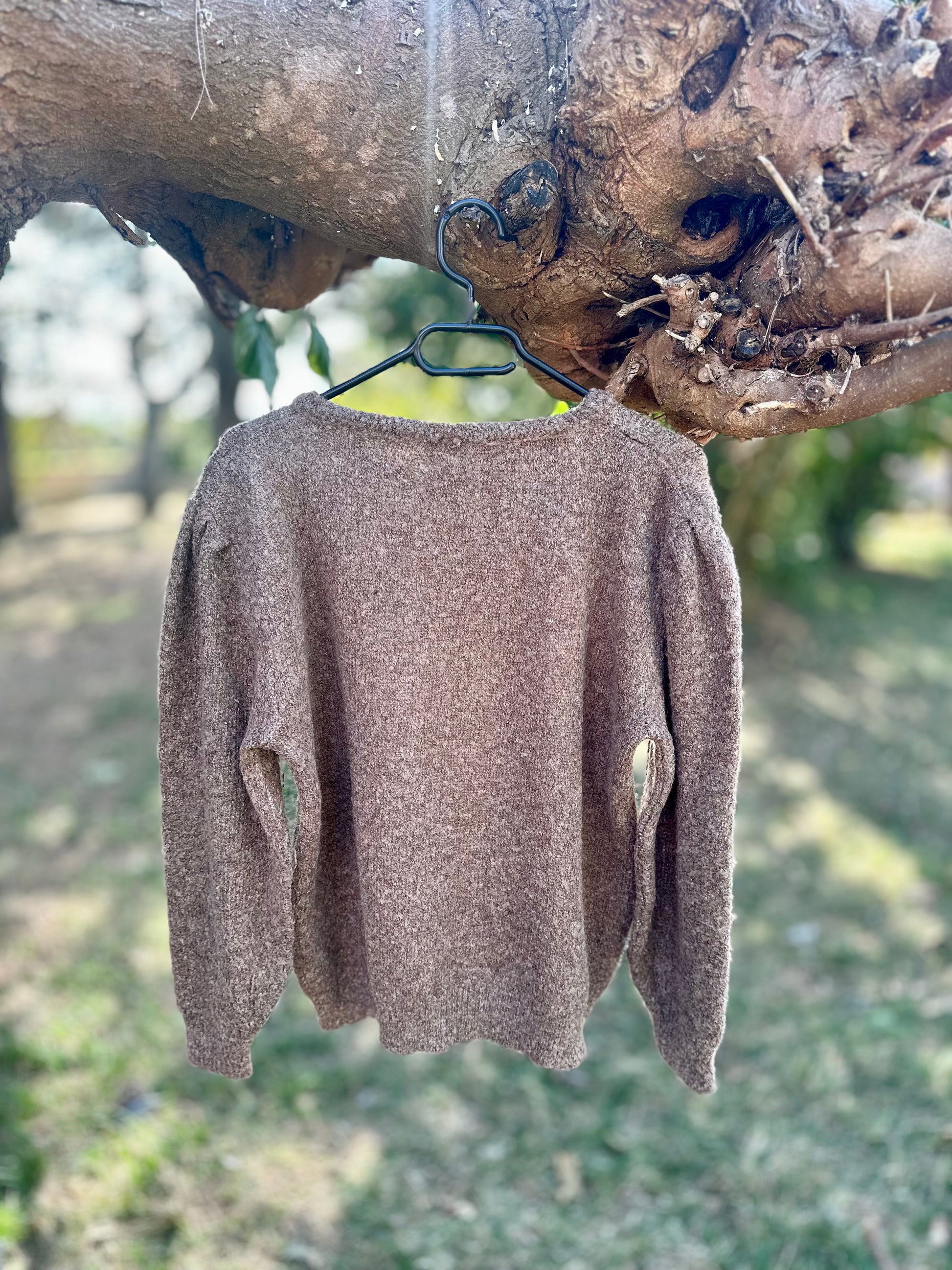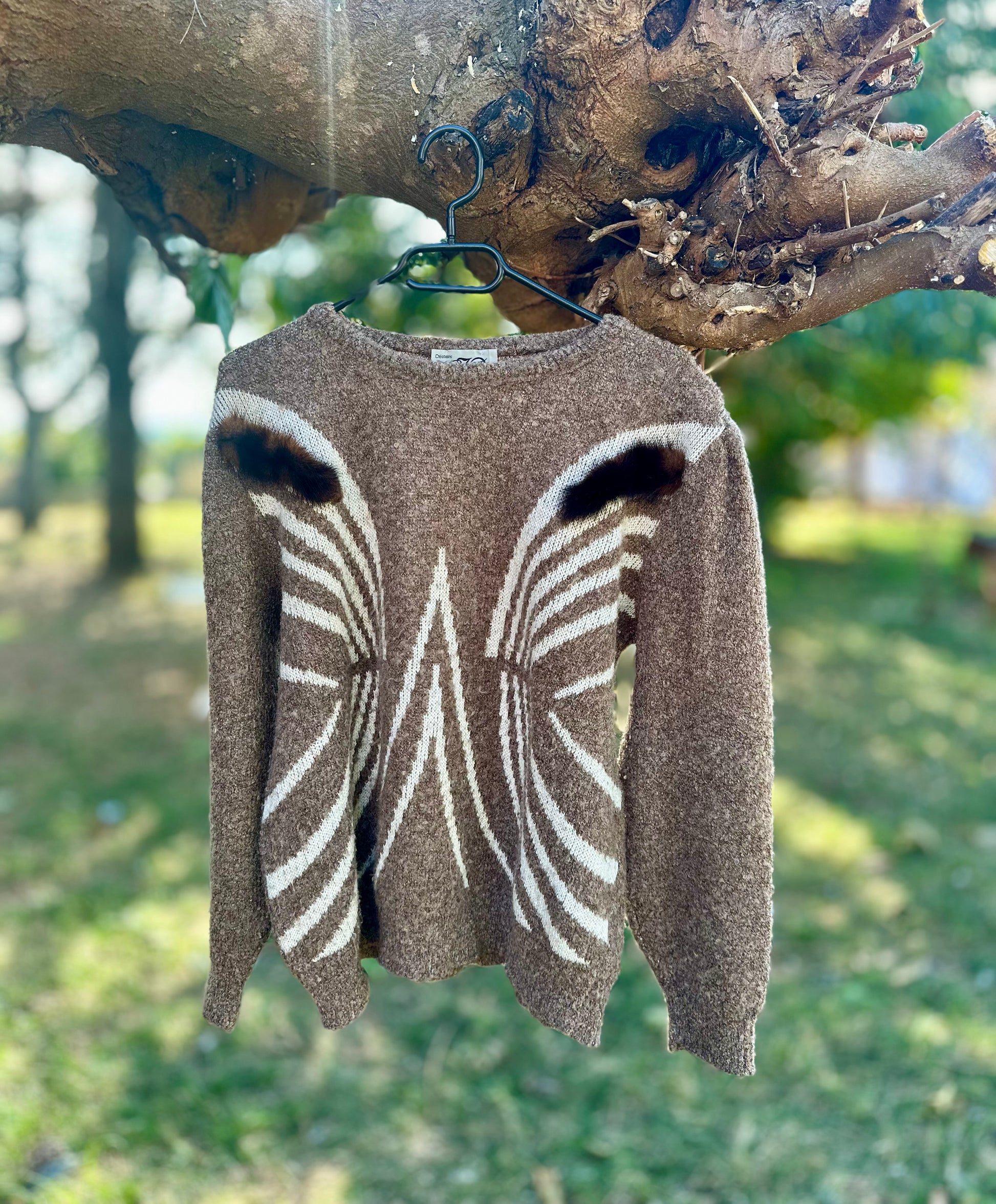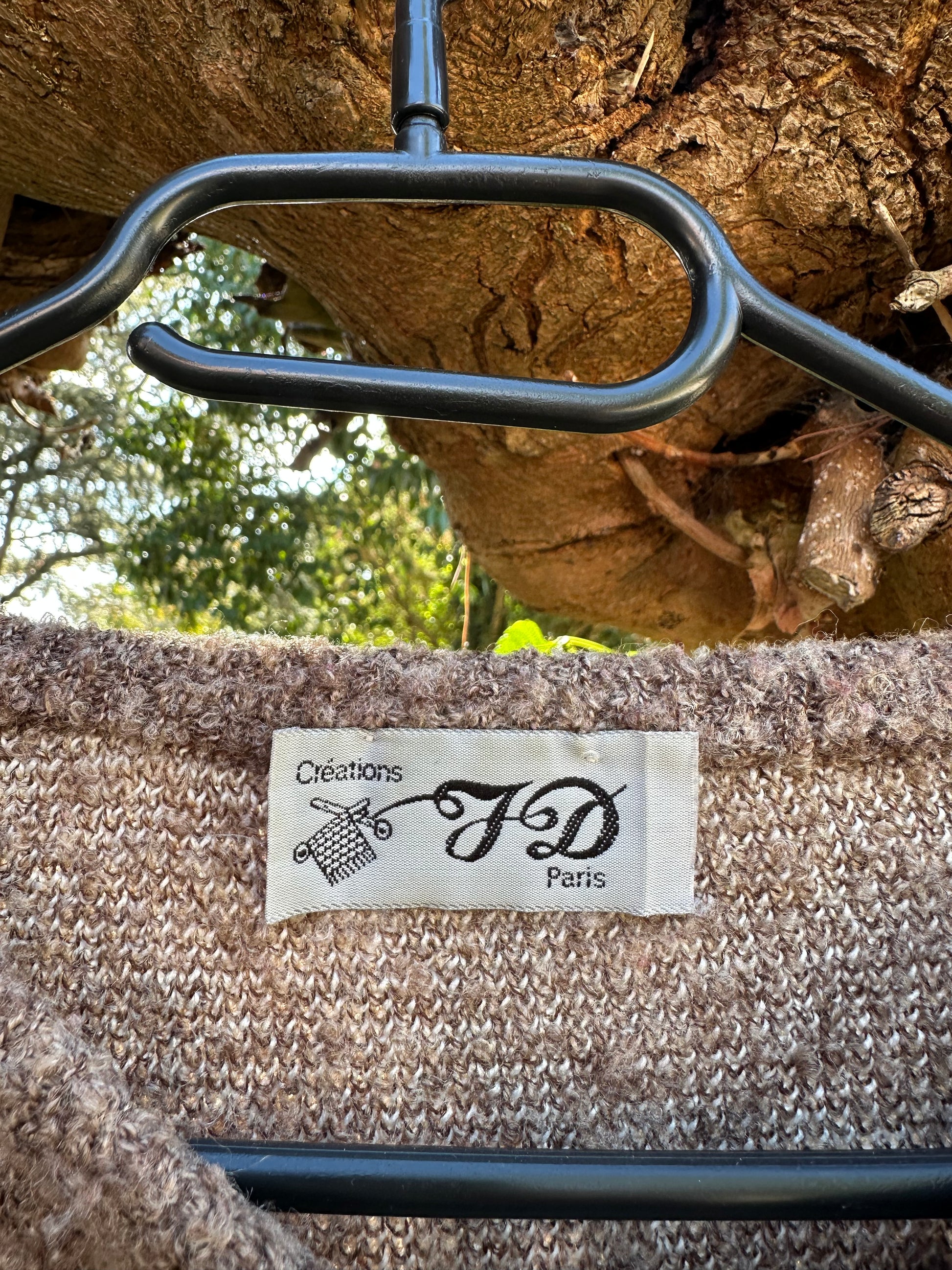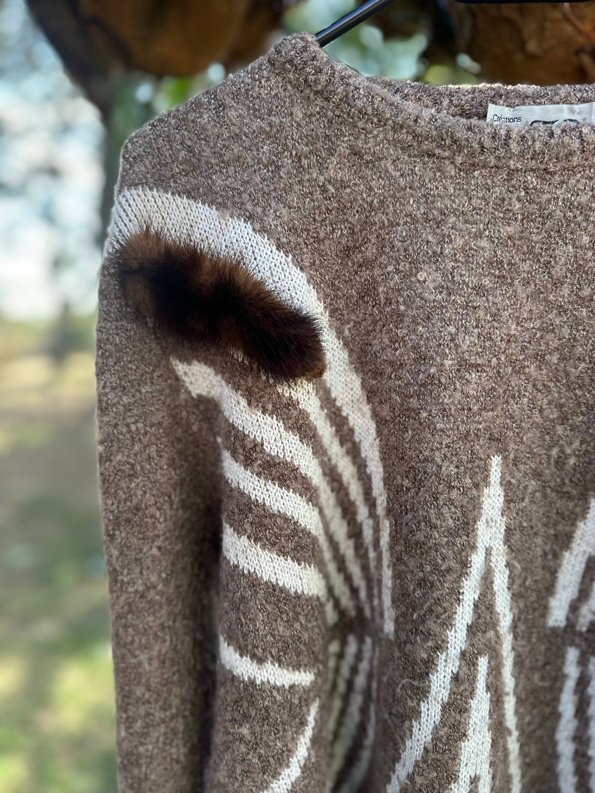 C’est un magnifique pull vintage en taille S, fabriquée en france. Dans les tons marrons avec deux détails fourrure sur le milieu devant.