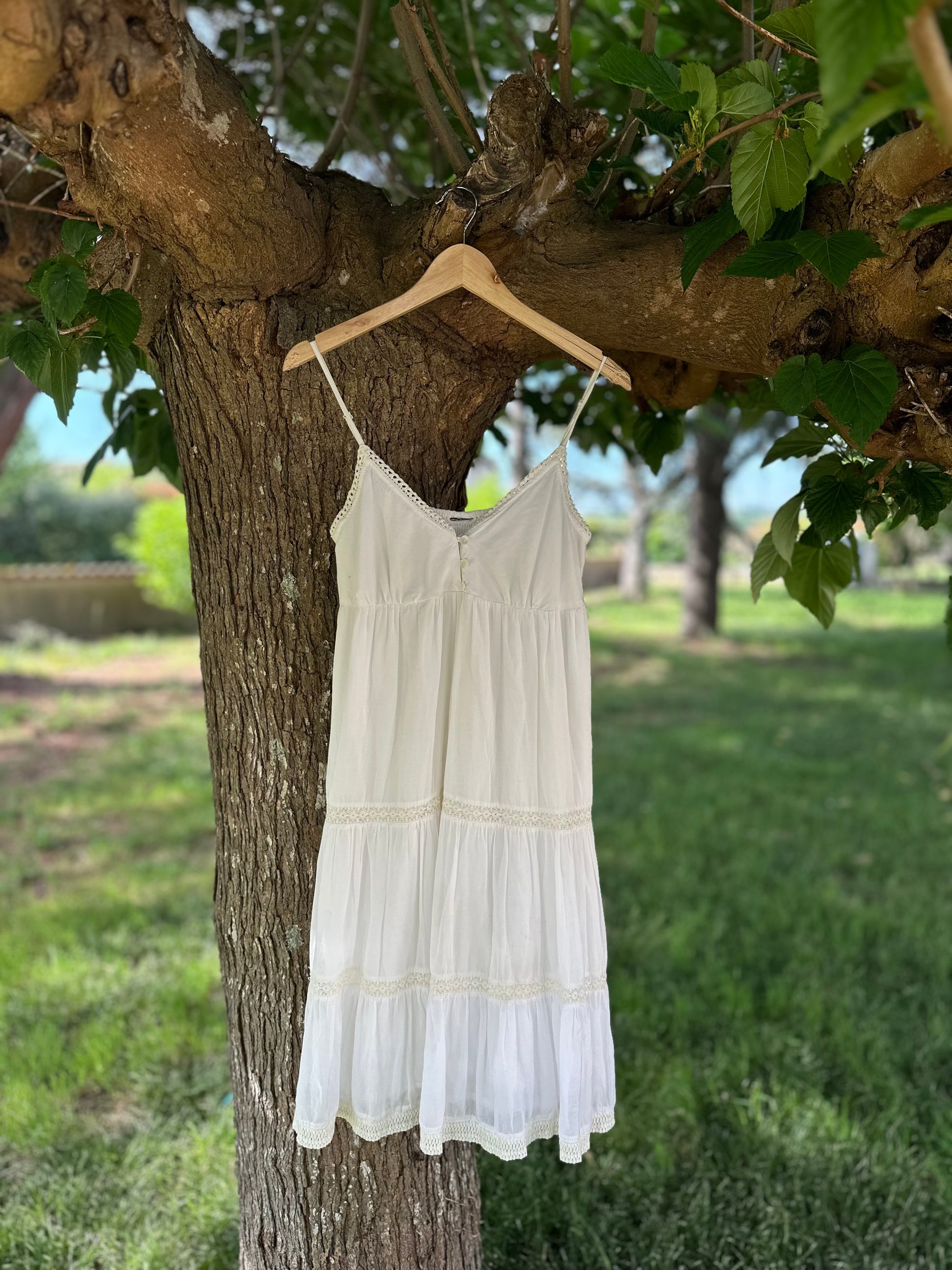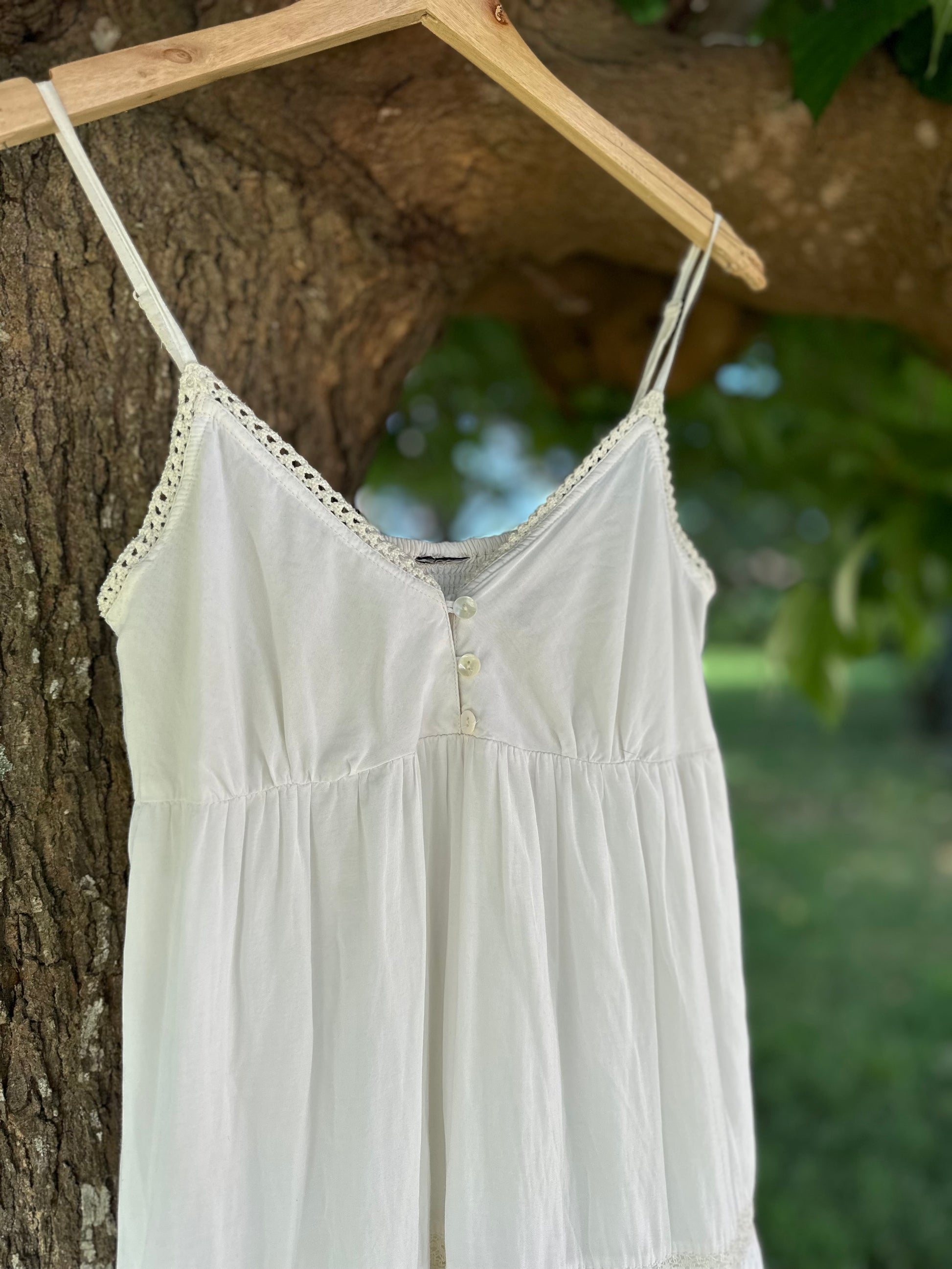 Élégante robe à bretelles, au charme rétro intemporel. Sa coupe mi-longue est soulignée par trois délicates bandes de dentelle qui habillent subtilement le bas de la robe. Le tissu est doublé, offrant un joli tombé et un confort optimal. Pièce vintage en très bon état - idéale pour une allure féminine et raffinée.